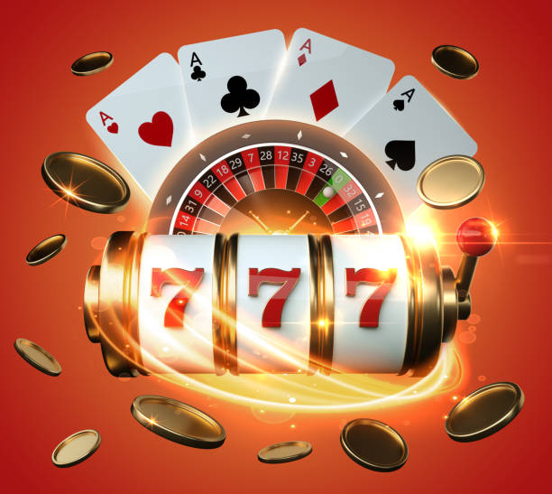 Modern Golden, White And Red Slot Machine, Roulette Wheel, Four Aces With Coins And Futuristic Neon Lights On Orange Background.