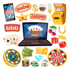 Online casino with all kinds of gamblings set. Play card games and fruit machines right inside your laptop isolated cartoon vector illustrations. Set of casino objects